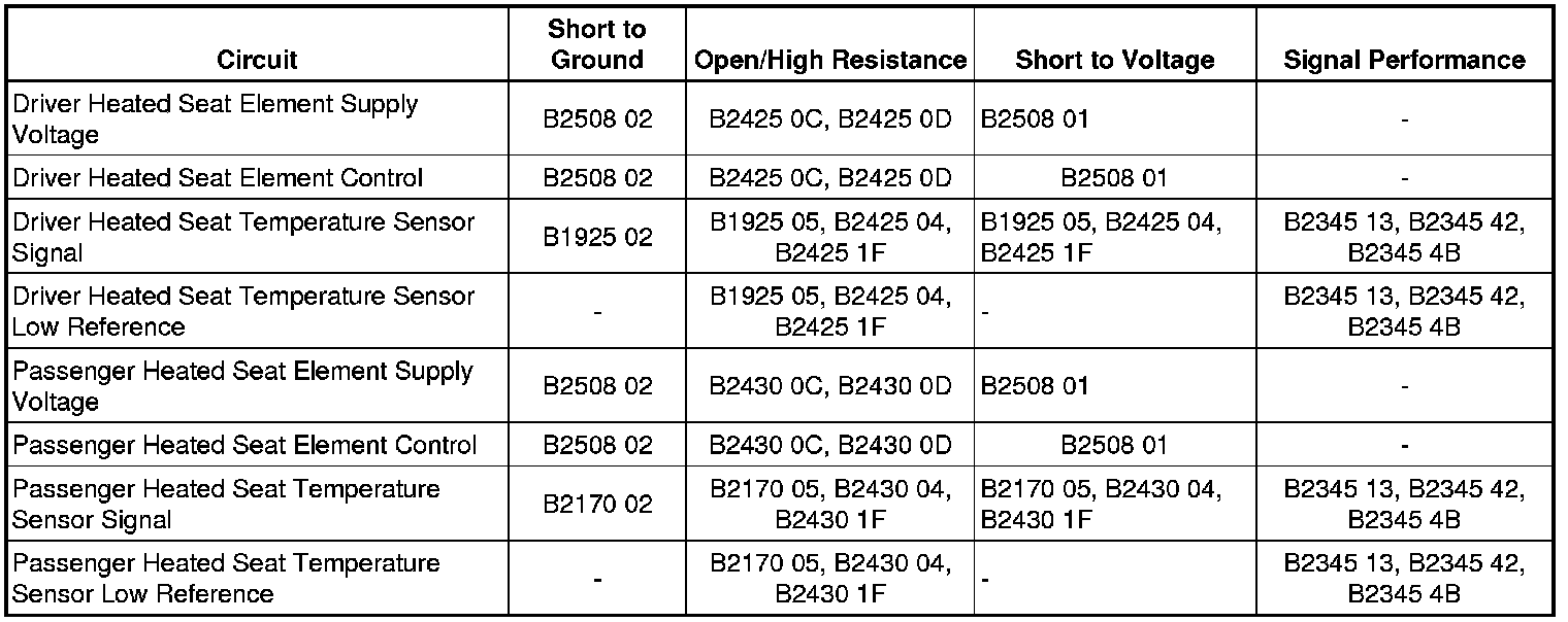 • If greater than the specified range, test the signal circuit and the low reference circuit for a short to voltage or an open/high resistance. If the circuits test normal, replace the seat temperature sensor.