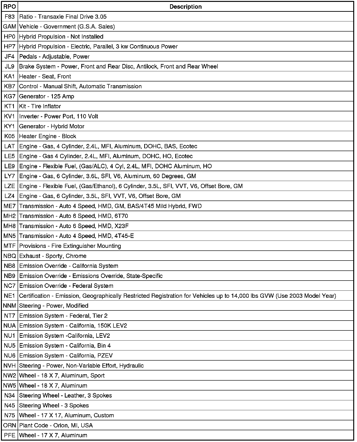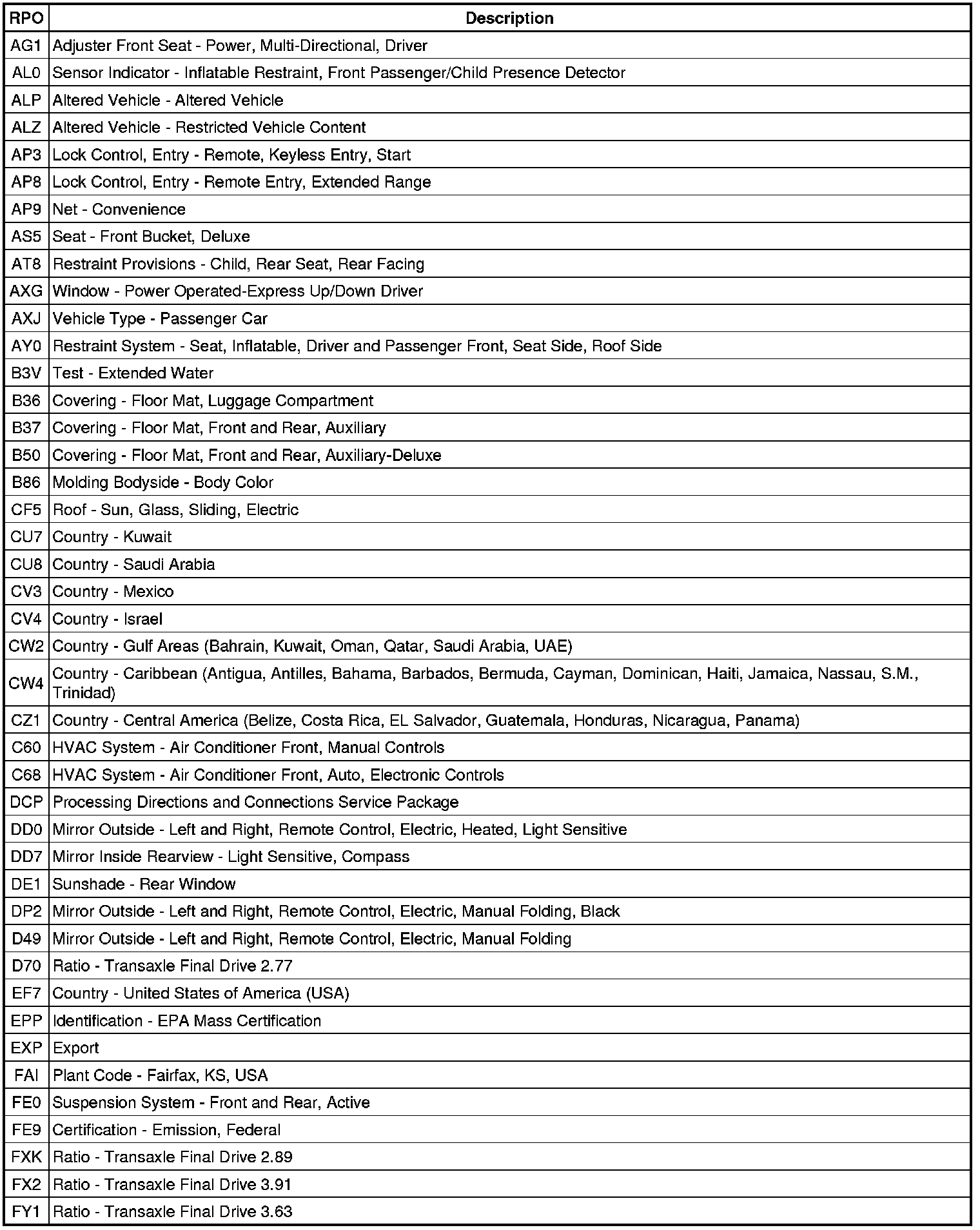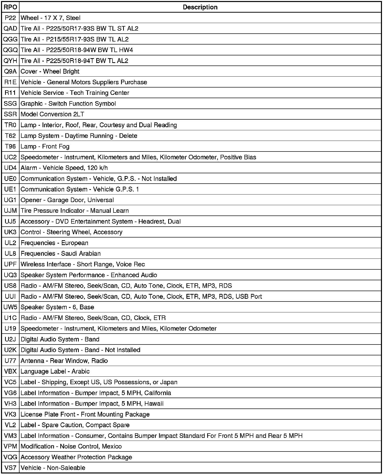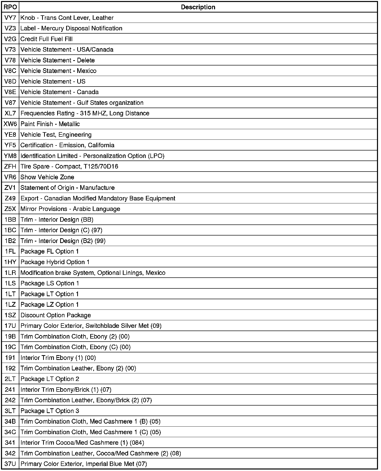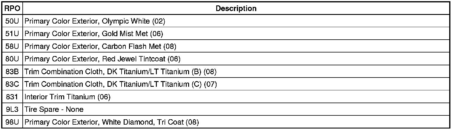 The following table provides the description of the Regular Production Option (RPO) codes that are available on the vehicle. The vehicle's RPO list is printed on the Service Parts Identification Label.