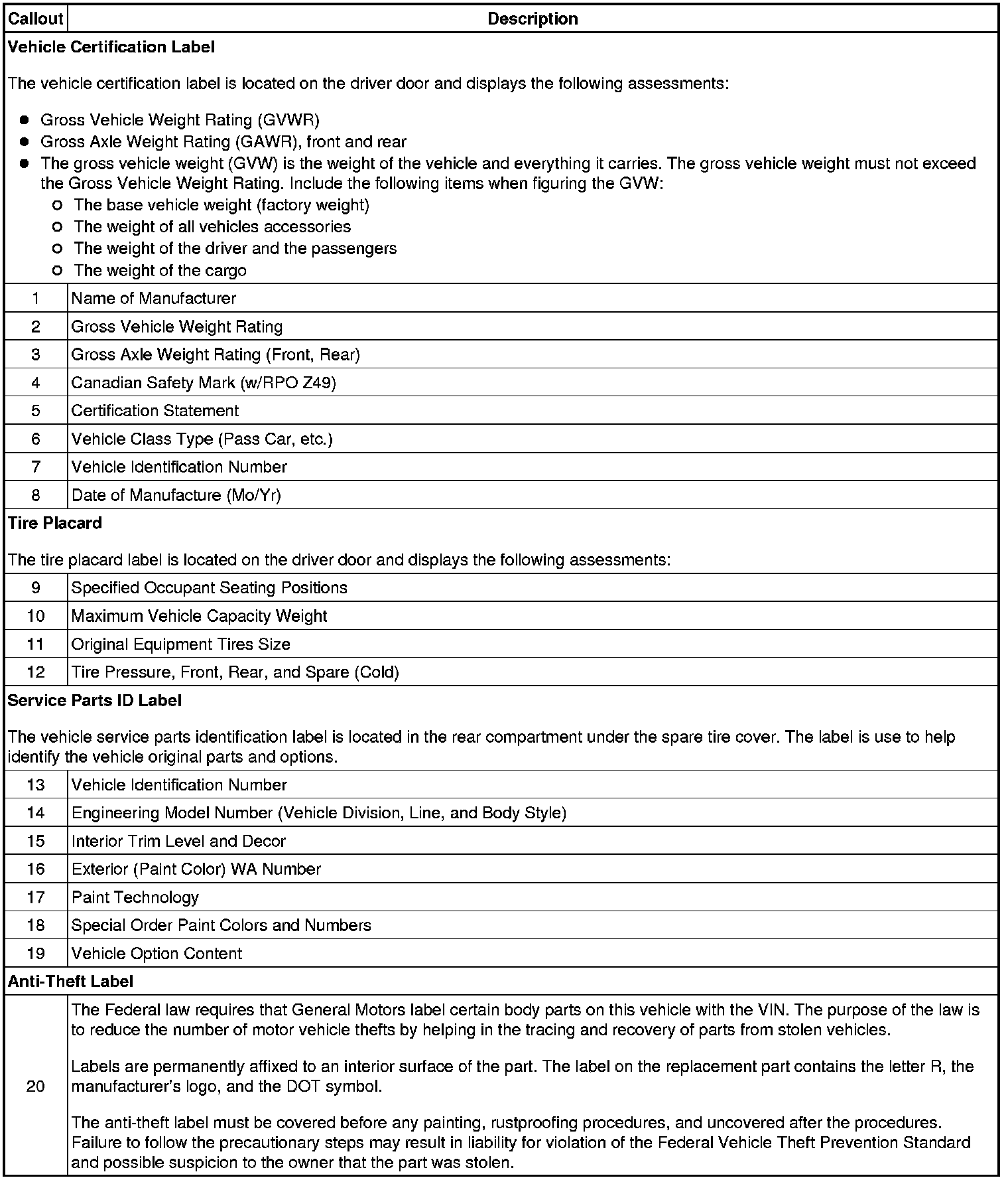 Vehicle Certification, Tire Placard, Anti-Theft, and Service Parts ID Label