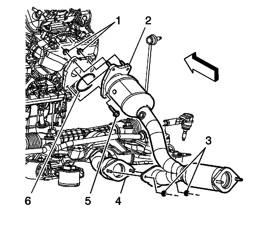 7. Remove the right (rear) catalytic converter bolt (5) and nuts (1) at the exhaust manifold.