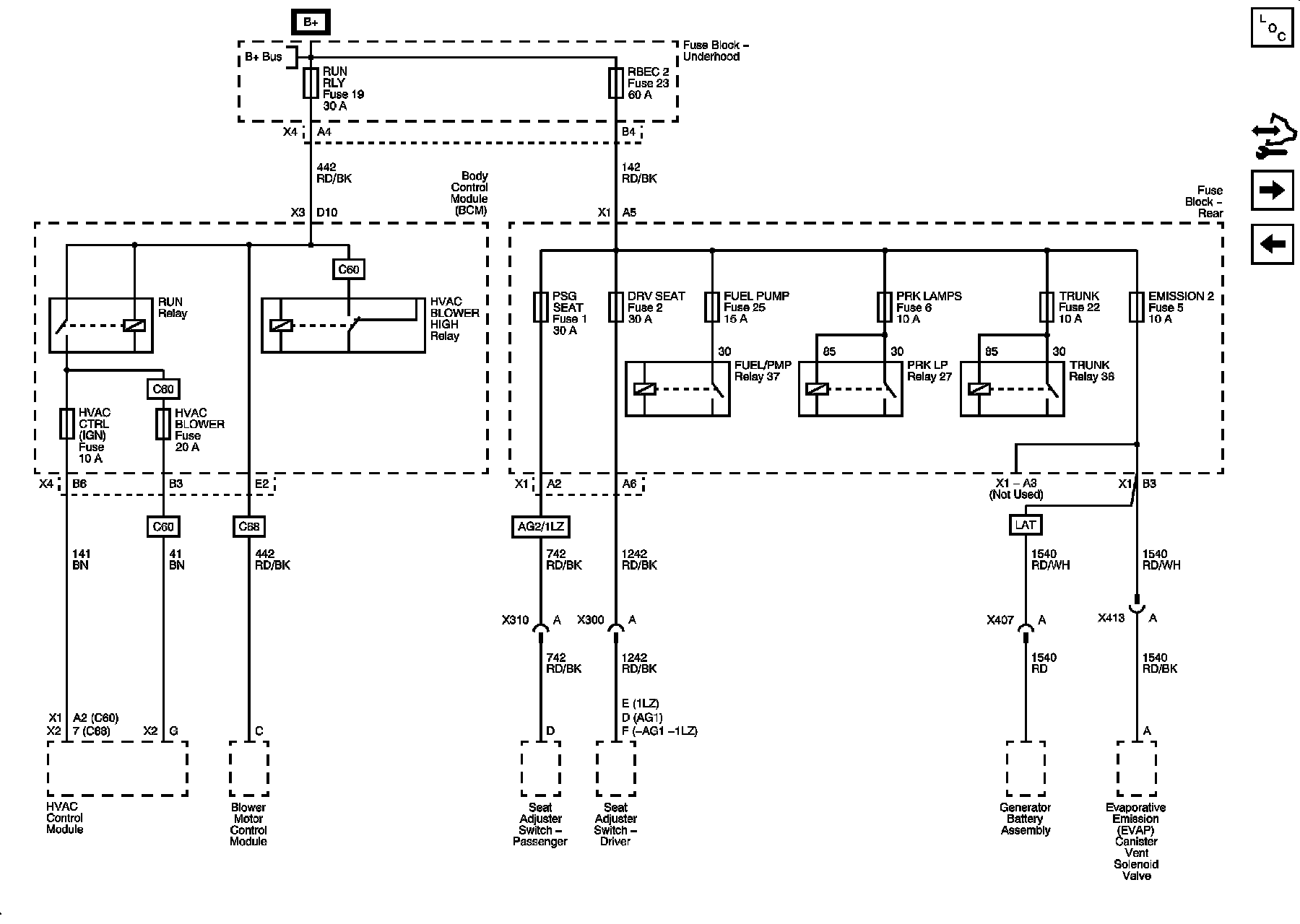 DRV SEAT, EMISSION 2, FUEL PUMP, HVAC BLOWER, HVAC CTRL (IGN), PRK LAMPS, PSG SEAT, RBEC 2, RUN RLY, and TRUNK Fuses