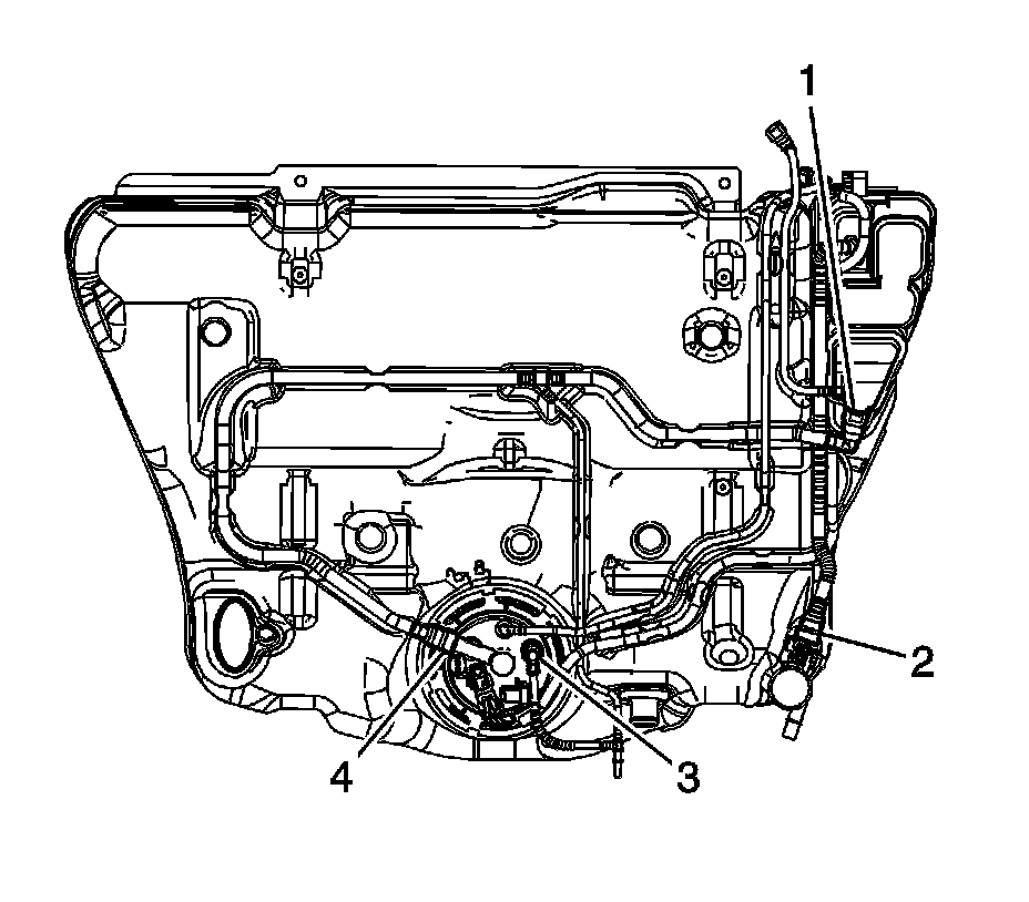 11. Connect the fuel tank vent pipe quick connect fittings (3, 4) to the module. Refer to Plastic Collar Quick Connect Fitting Service (Plastic Collar Quick Connect Fitting Service).