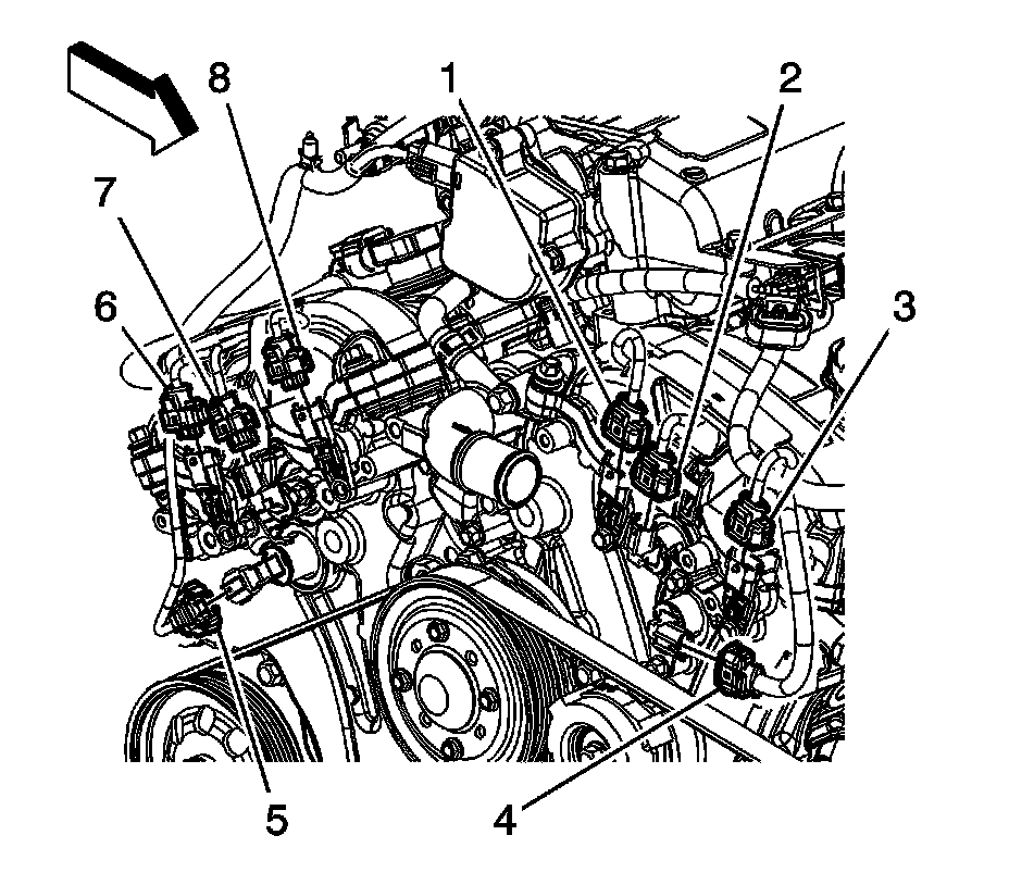 2. Disconnect the engine wiring harness electrical connector (8) from the bank 1 intake camshaft position (CMP) sensor.