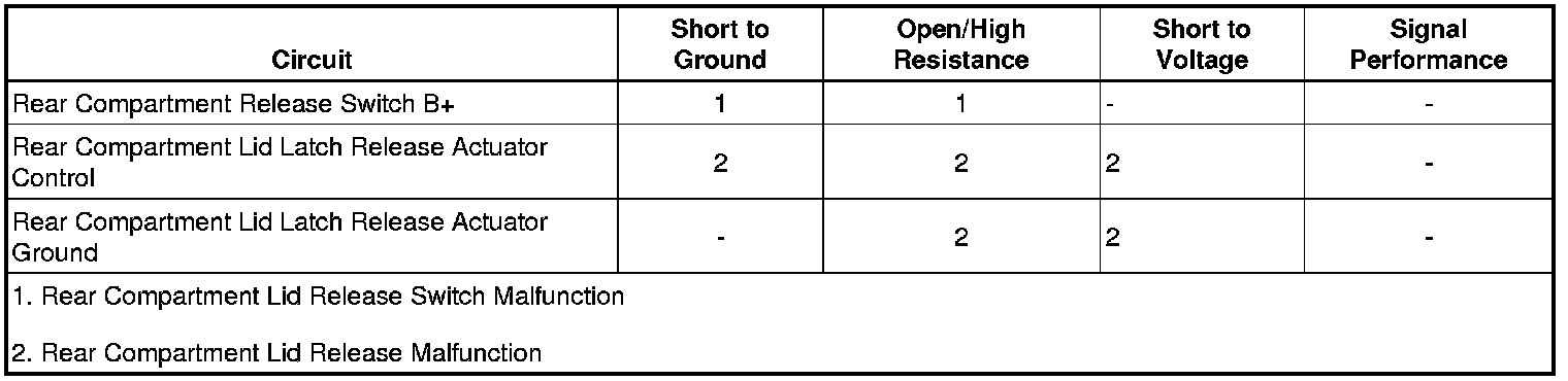 When the rear compartment lid release switch is pushed, the contact within the switch closes allowing B+ voltage to flow through the rear compartment lid latch release actuator control circuit causing the actuator to release the liftgate/trunk lid. The rear compartment lid latch release actuator is continuously grounded. The actuator may also release the liftgate/trunk lid by a RELEASE command from the remote control door lock receiver (RCDLR).