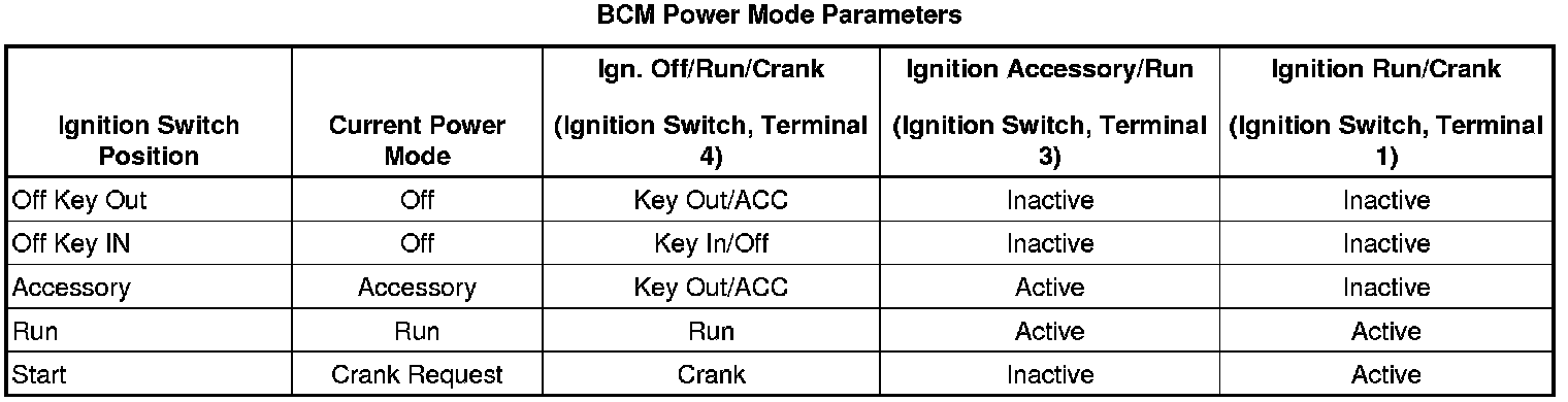 With a scan tool, access IPC, Power Mode data display list and compare all parameters listed with the corresponding ignition key position. The IPC Power Mode Parameters table below illustrates the correct state of these input parameters in correspondence to the ignition switch position. The circuits which the individual parameters are related to are in parentheses.