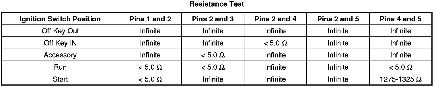2. Verify the resistance between the terminals listed below match for each ignition switch position.