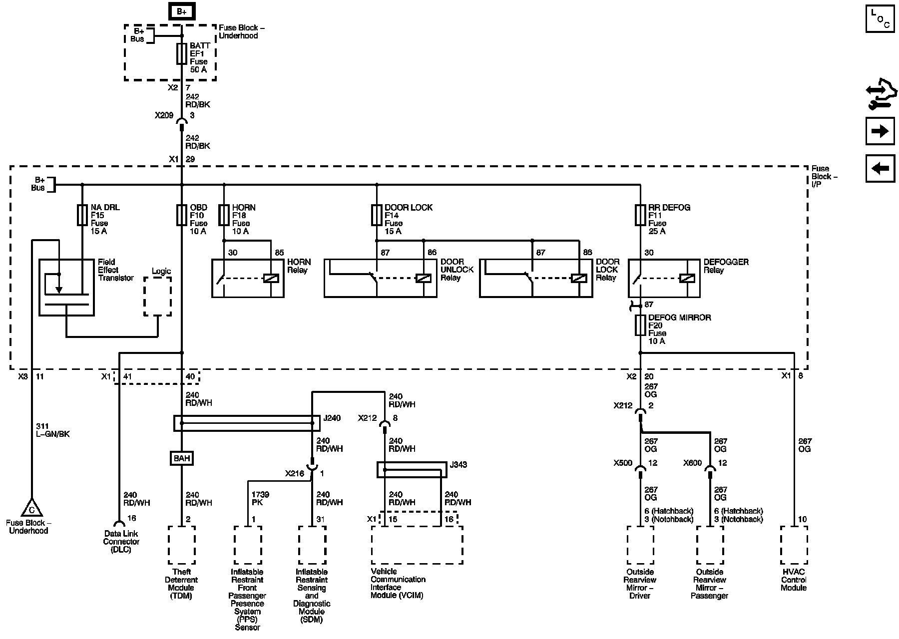 BATT, DEFOG MIRROR, DOOR LOCK, HORN, NA DRL, OBD, and RR DEFOG Fuses