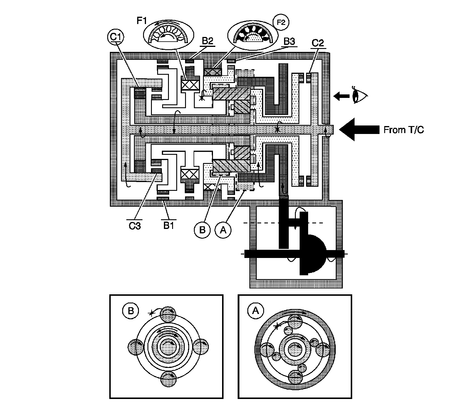 When the one-way clutch No. 2 (F2) operates, it revolves counterclockwise of the planetary carrier.