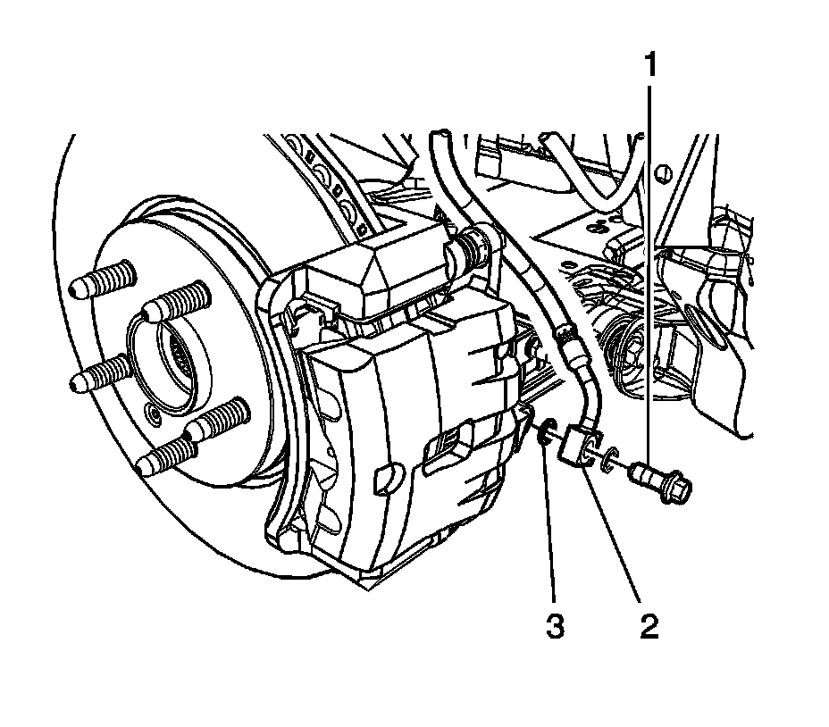 4. Assemble the brake hose fitting bolt (1) and 2 new brake hose fitting gaskets (2) to the brake hose (3) and tighten the fitting bolt to 40 Nm (30 lb ft).