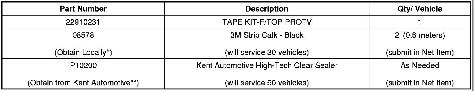 The tape kit required to complete this program is to be obtained from General Motors Customer Care and Aftersales (GMCC&A). Please refer to your "involved vehicles listing" before ordering parts. Normal orders should be placed on a DRO = Daily Replenishment Order. In an emergency situation, parts should be ordered on a CSO = Customer Special Order.