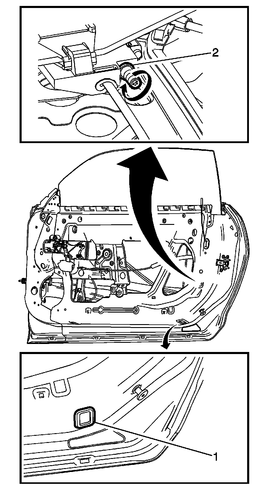 1. Remove the access plug (2) in the lower inside edge of the door.