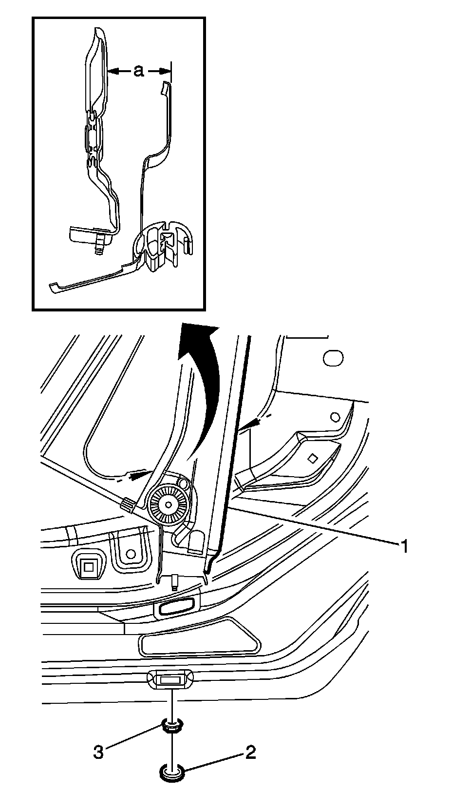 11. Verify that the measurement (a) from the inboard surface of the inner panel to the front regulator rail is 51 mm (2 in), if correct go to the next step. If not do the following: