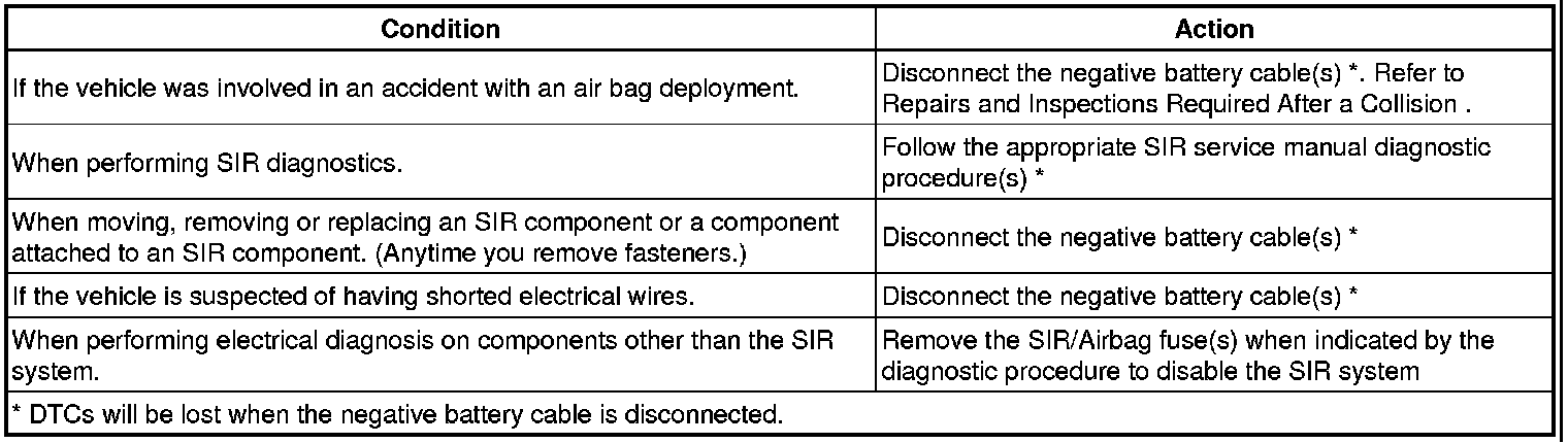 When performing service on or near the SIR components or the SIR wiring, the SIR system must be disabled. Failure to observe the correct procedure could cause deployment of the SIR components. Serious injury can occur. Failure to observe the correct procedure could also result in unnecessary SIR system repairs.