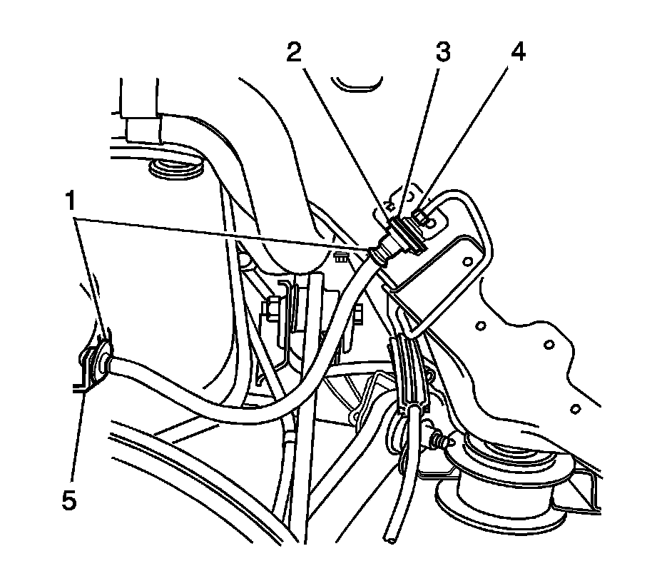 27.Attach the brake hose (1) from the upper control arm mounted brake hose retaining bracket (5).