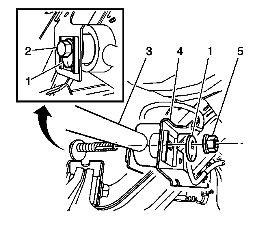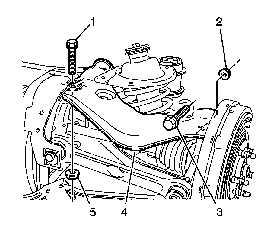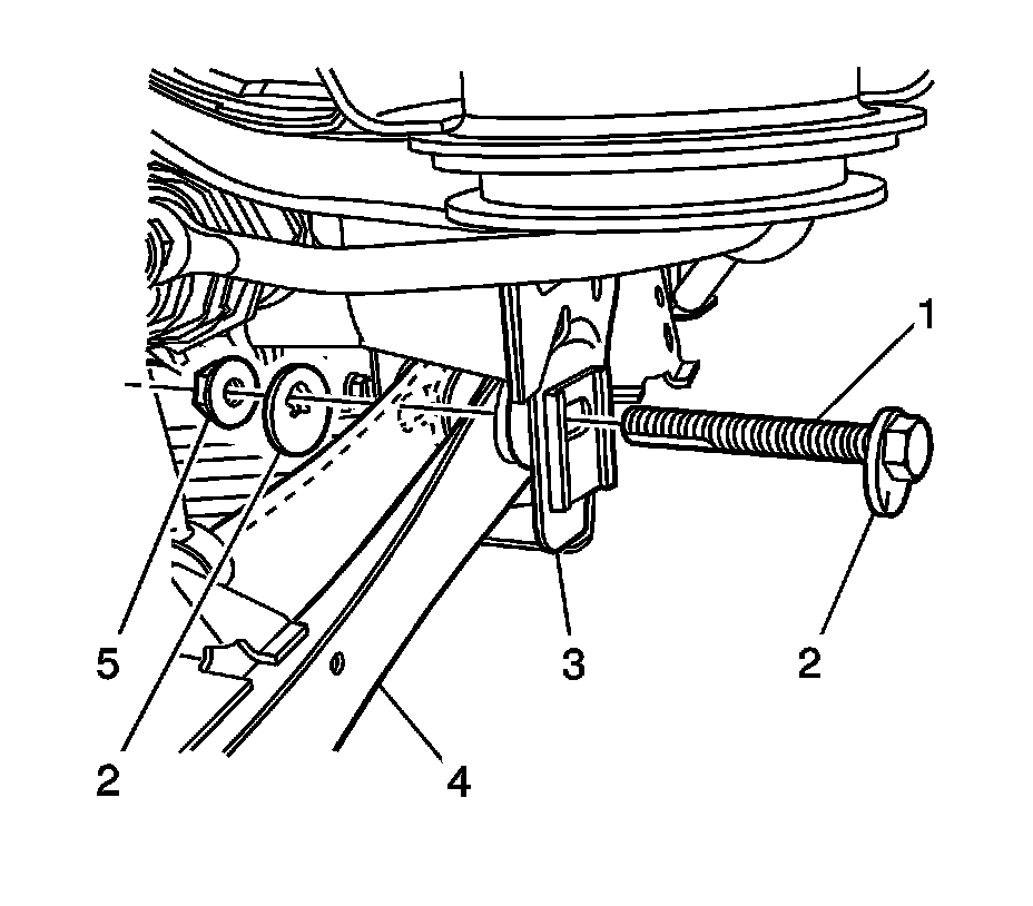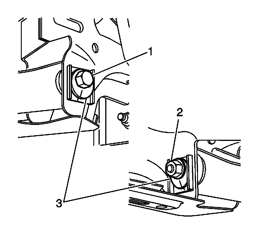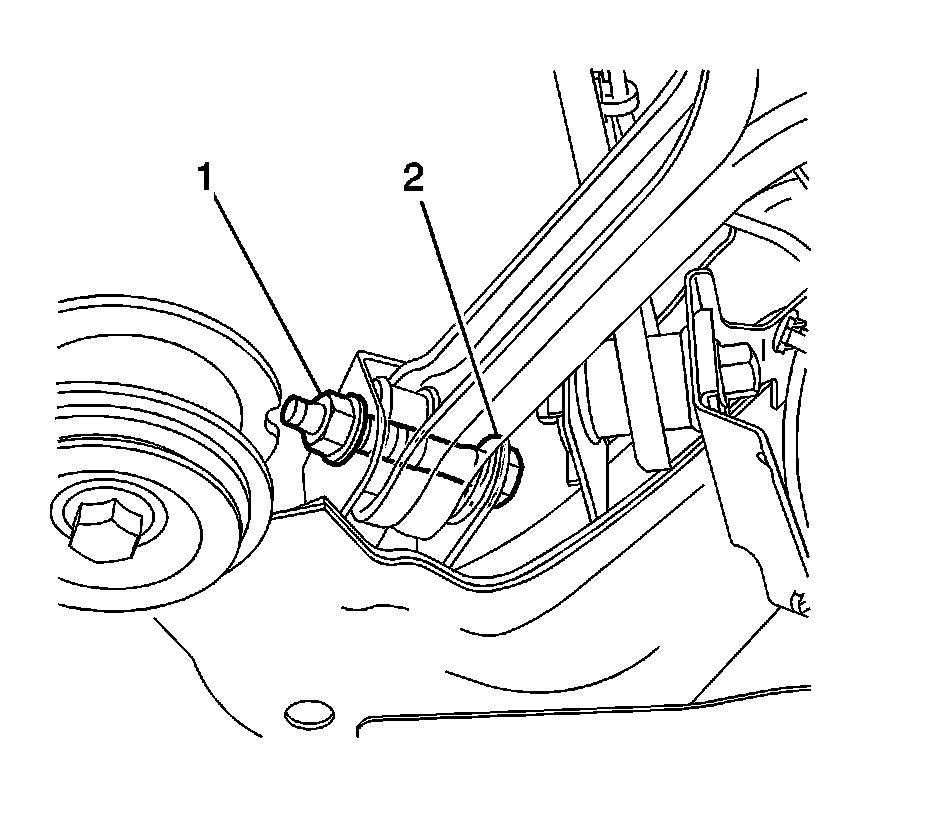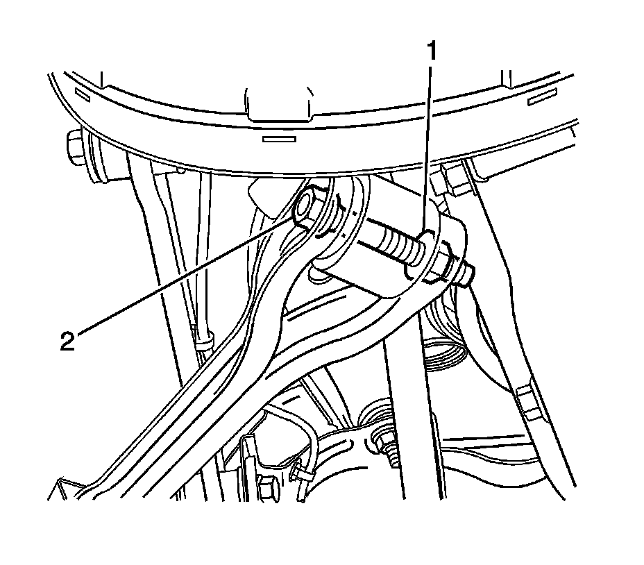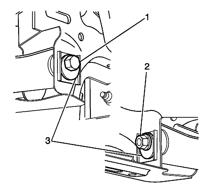 Note:The lower control arm to subframe retaining bolt (1) and nut (2) eccentric washers (3) that are used to adjust the rear suspension camber. One eccentric washer (3) is mounted directly to the head of the lower control arm to subframe retaining bolt (1).