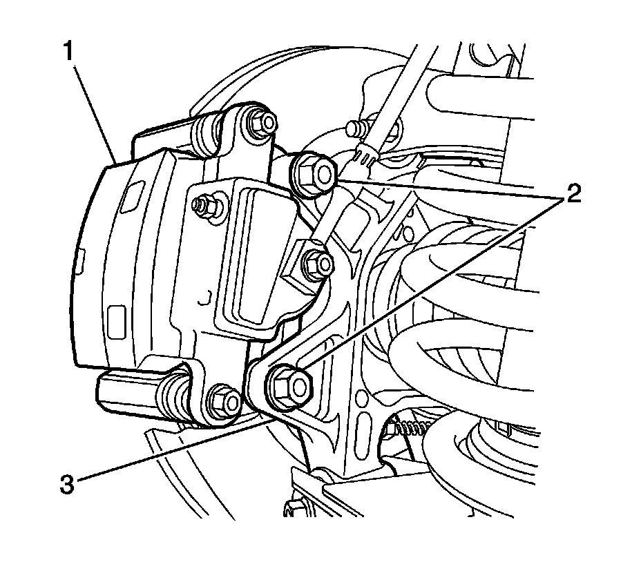 9.Remove the brake caliper anchor plate to knuckle retaining bolts (2).