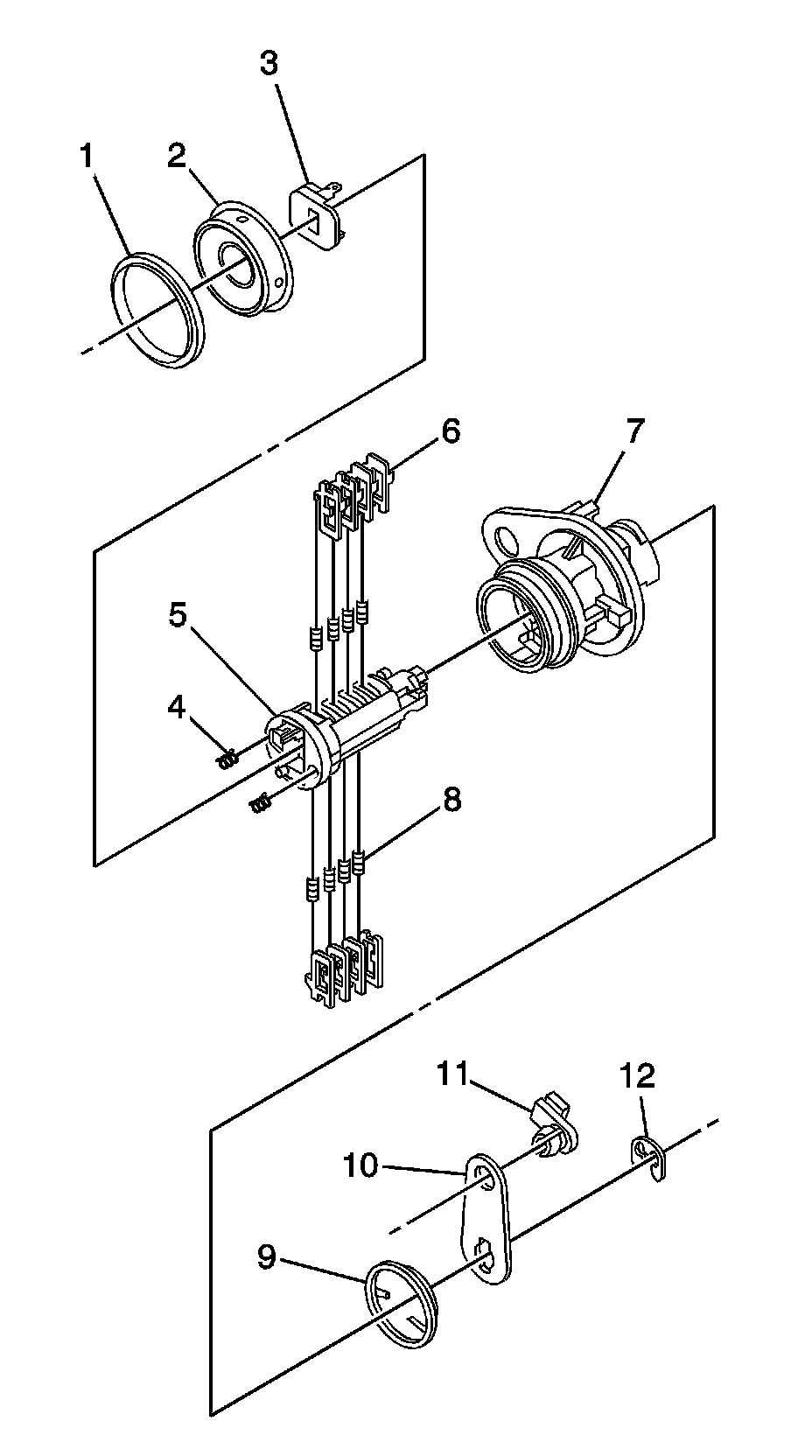 3. Install the tumbler (6) for key cut position one in the slot nearest to the front of the lock cylinder. Install the remaining tumblers, key cut positions 3, 5, and 7, following the key code and same process. Press the tumblers in place until they are secure.