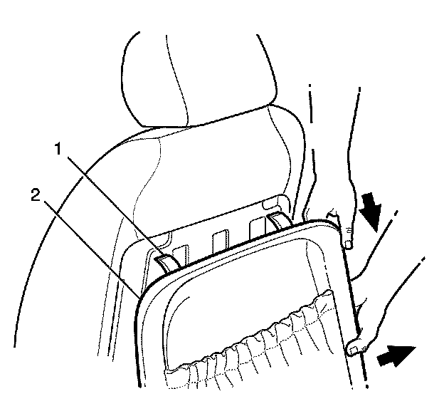 2. Push the front seat-back rear trim cover (2) up and in at the lower edge to engage the two lower retaining clips.