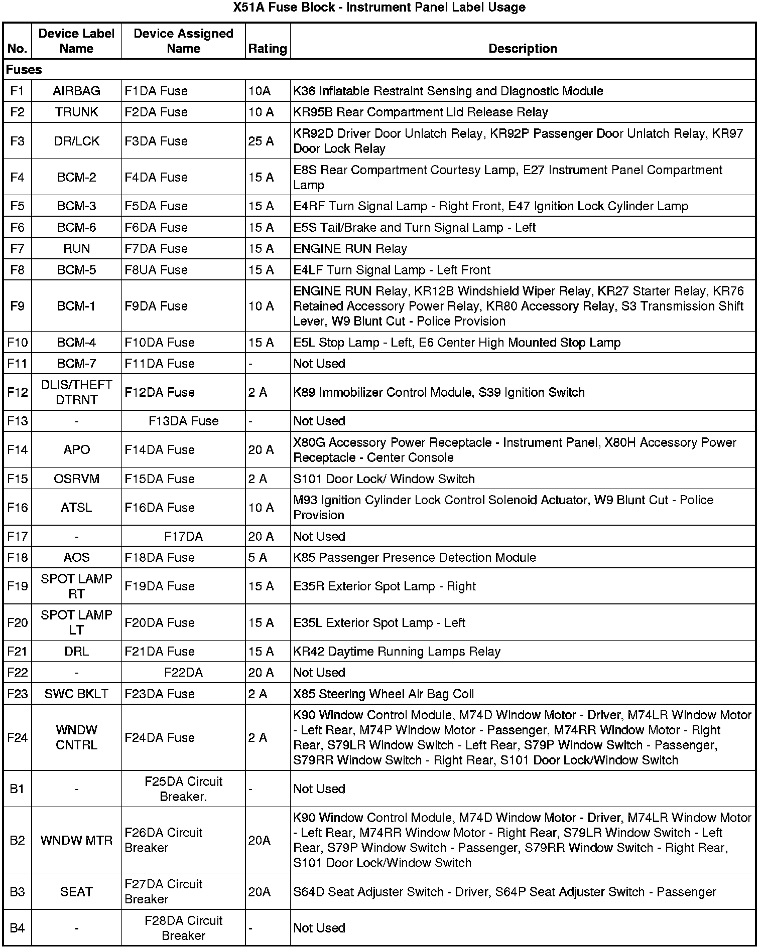 X51A Fuse Block - Instrument Panel Label