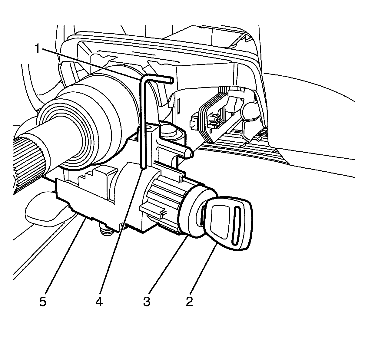 11. Remove the ignition lock cylinder (3) and ignition key (2) assembly from the ignition lock cylinder housing (5).