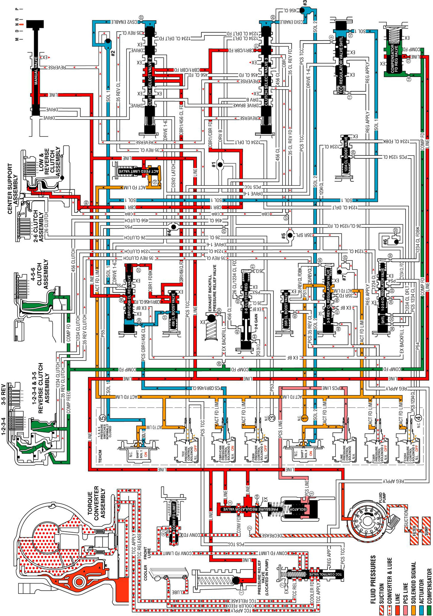 The 3-5 reverse clutch spring force combined with a force from the compensator moves the 3-5 reverse clutch piston to release the 3-5 reverse clutch plates and force 3-5 reverse clutch fluid to exhaust from the 1-2-3-4 and 3-5 reverse clutch housing. The 3-5 reverse clutch fluid is then routed to the 3-5 reverse clutch regulator valve allowing the 3-5 reverse clutch to release.