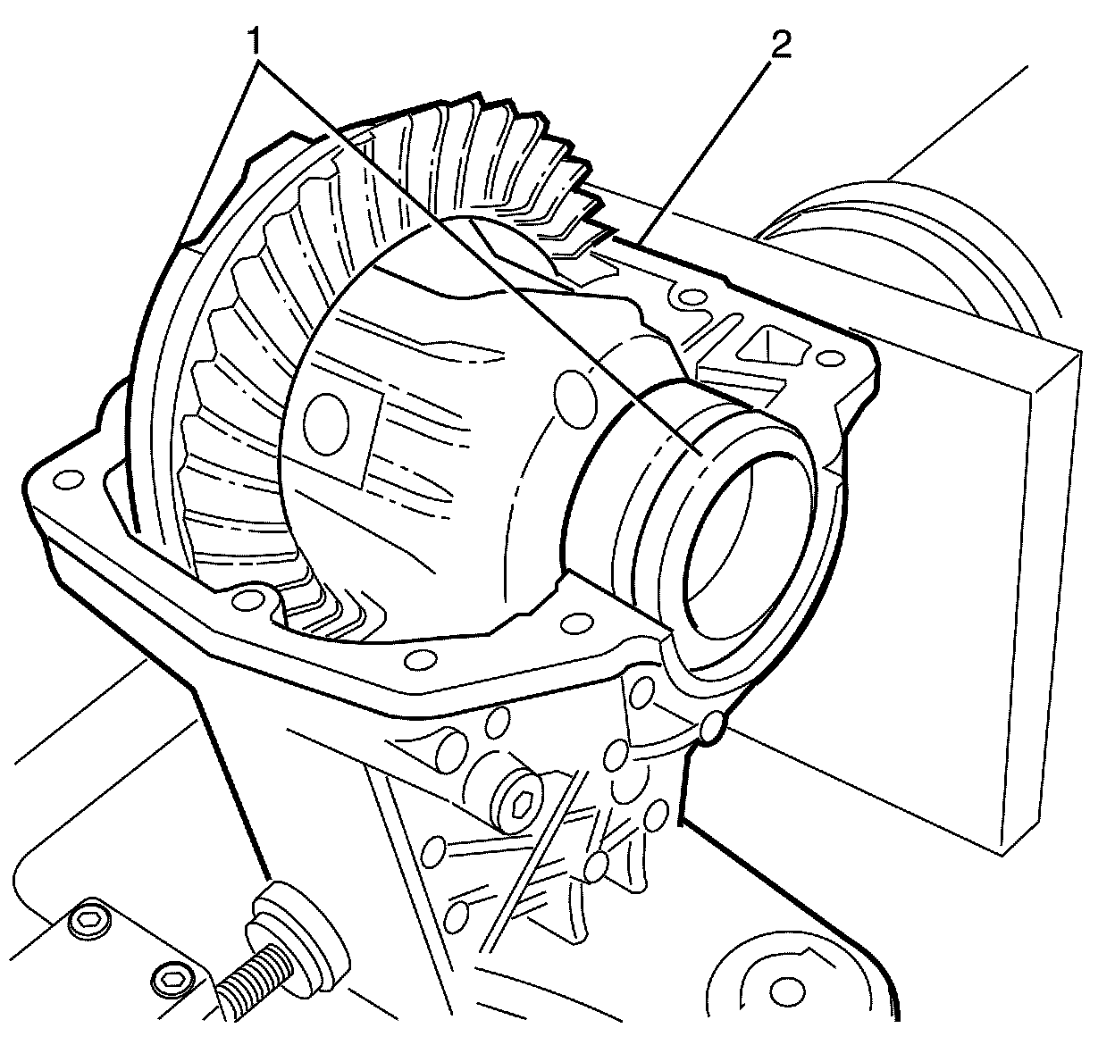 Note: Use suitable tools or a suitable press to remove the ring gear (1) from the differential (2). Take care not to damage the ring gear retaining bolt hole threads.
