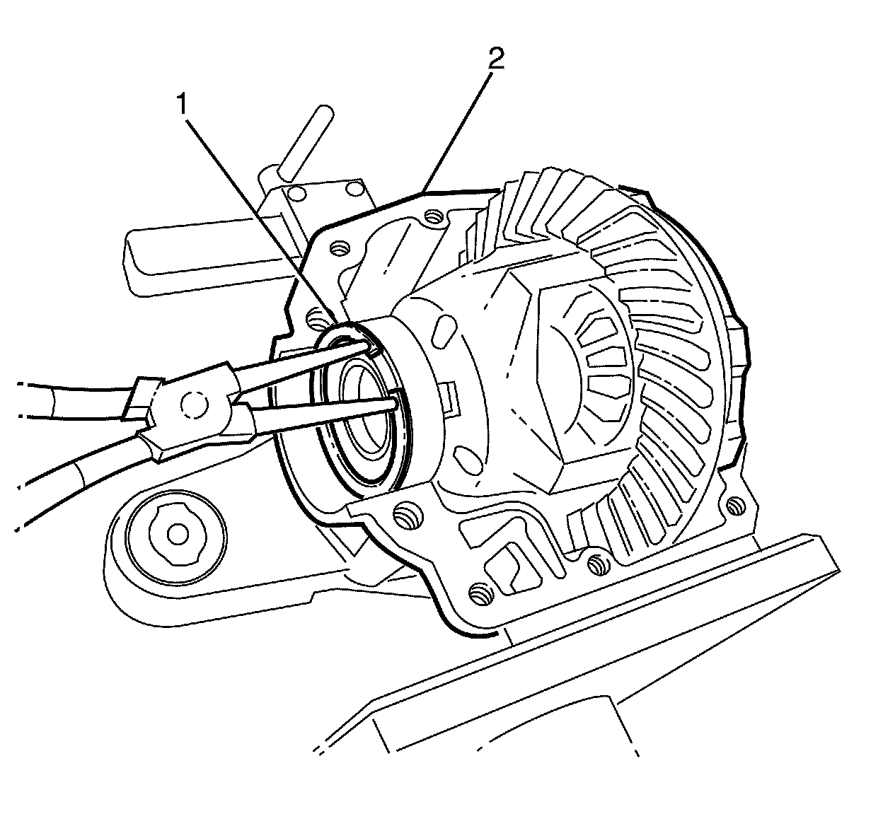 7. Remove the left and right axle shaft seals (1) from the differential (2).