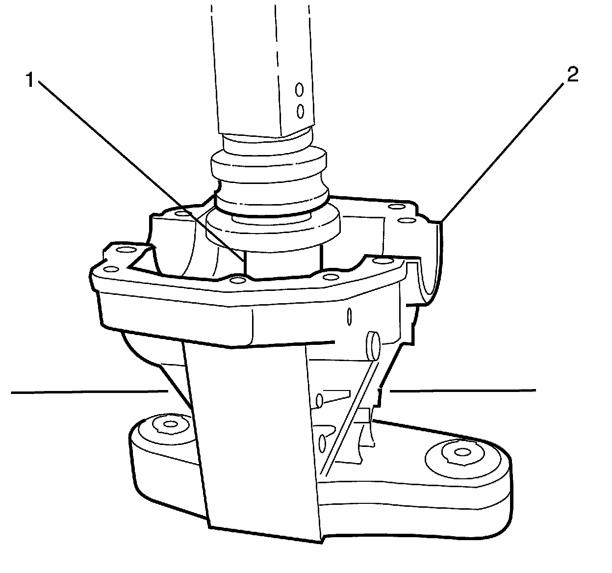 27. Position the DT-48805 - pinion tail bearing cup remover (1) to the differential housing (2) and press out the tail bearing cup.