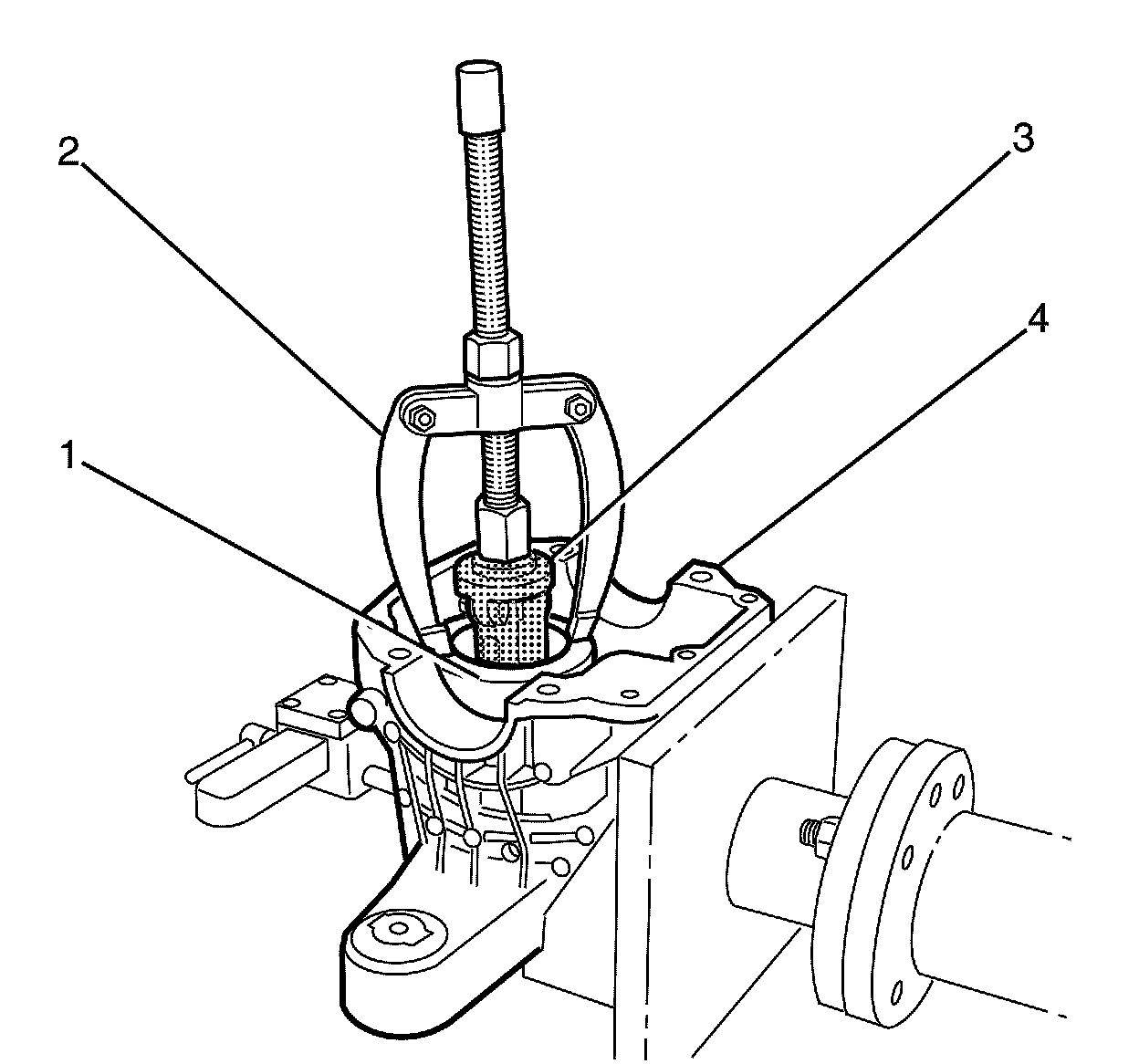 29. Position DT-48726 - pinion head bearing cup remover (3) to the differential housing (4) and pull out the head bearing cup.