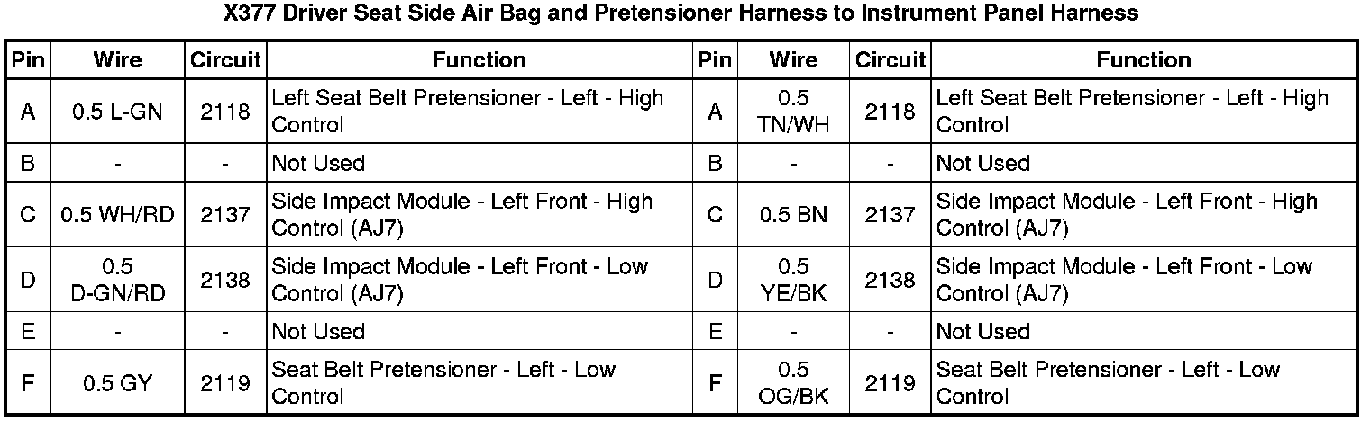 X377 Driver Seat Side Air Bag and Pretensioner Harness to Instrument Panel Harness