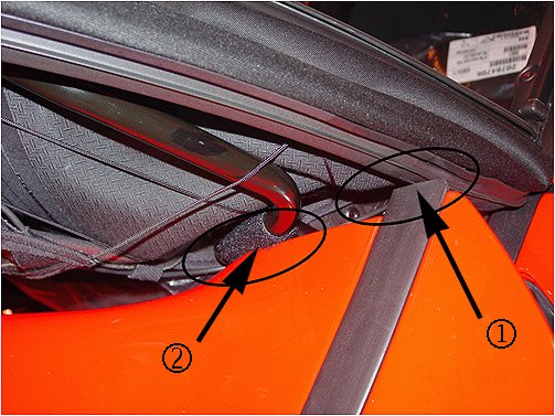 2. With the folding top stowed in the rear compartment, access the lower B-pillar stop (1) by lifting the side flipper door (2).