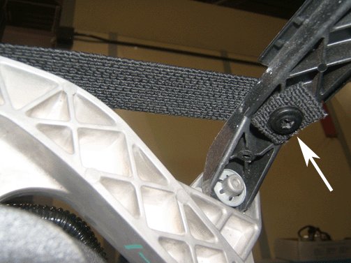 2. Reposition the headliner as necessary for access. Remove the underside screw (at arrow above) retaining the tension strap to the #4 bow.