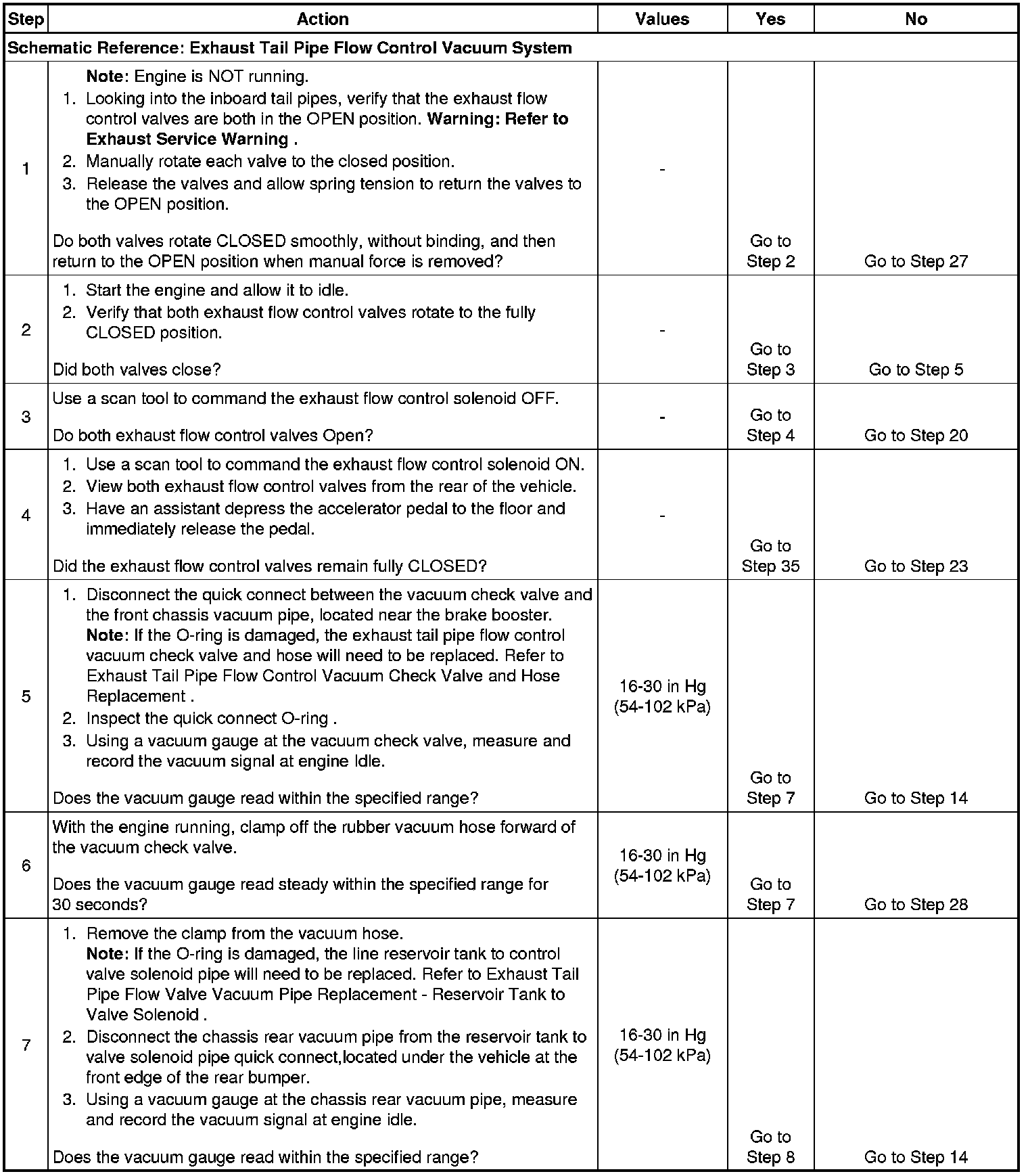 System diagnosis includes reviewing the system Exhaust Tail Pipe Flow Control System Description and Operation (Exhaust Tail Pipe Flow Control System Description and Operation). Reviewing the information will help determine when a malfunction exists. It will also help to determine if the condition described by the customer is a normal system operation. Refer to Symptoms - Engine Exhaust (Symptoms - Engine Exhaust) in order to identify the correct procedure for diagnosing the system.