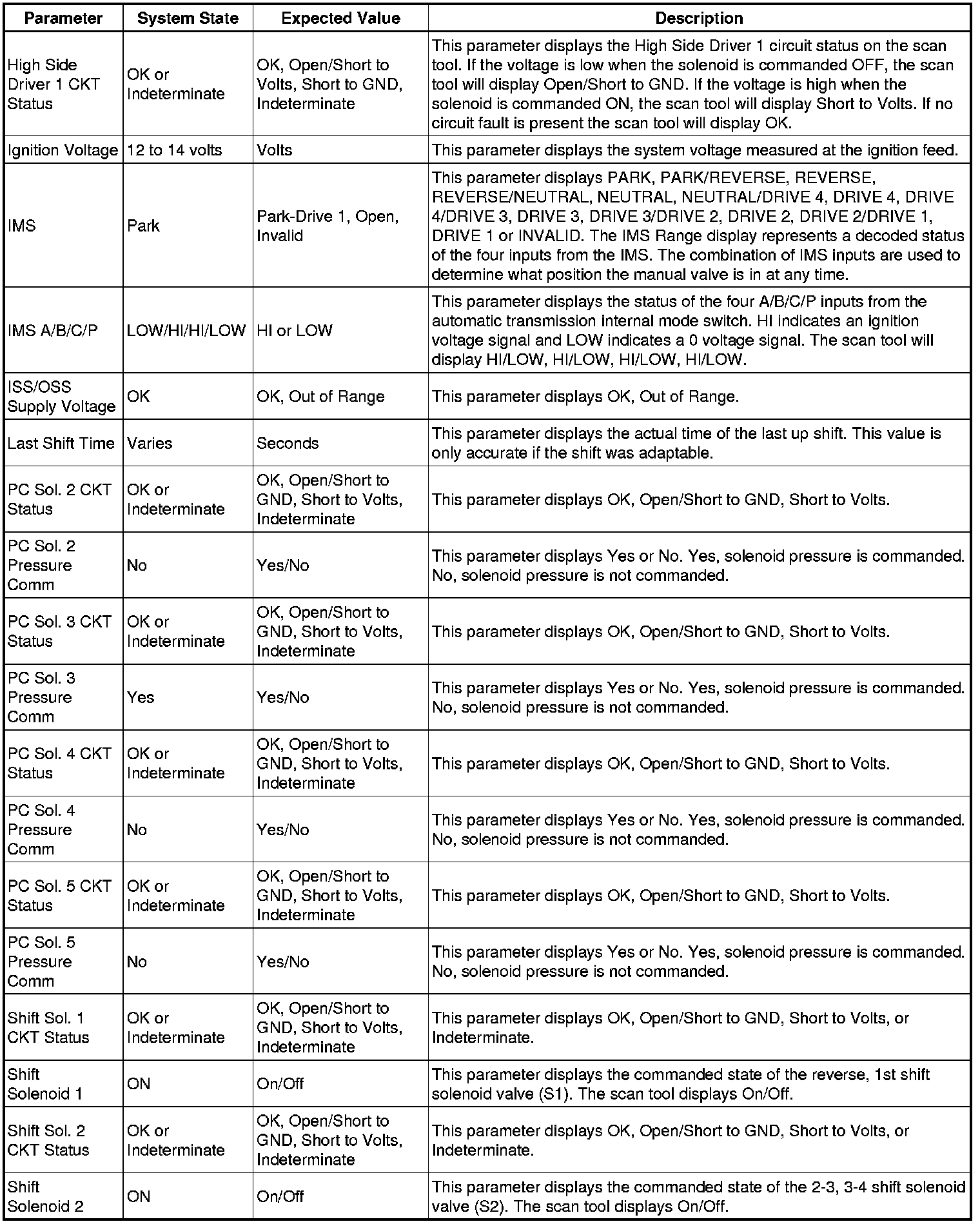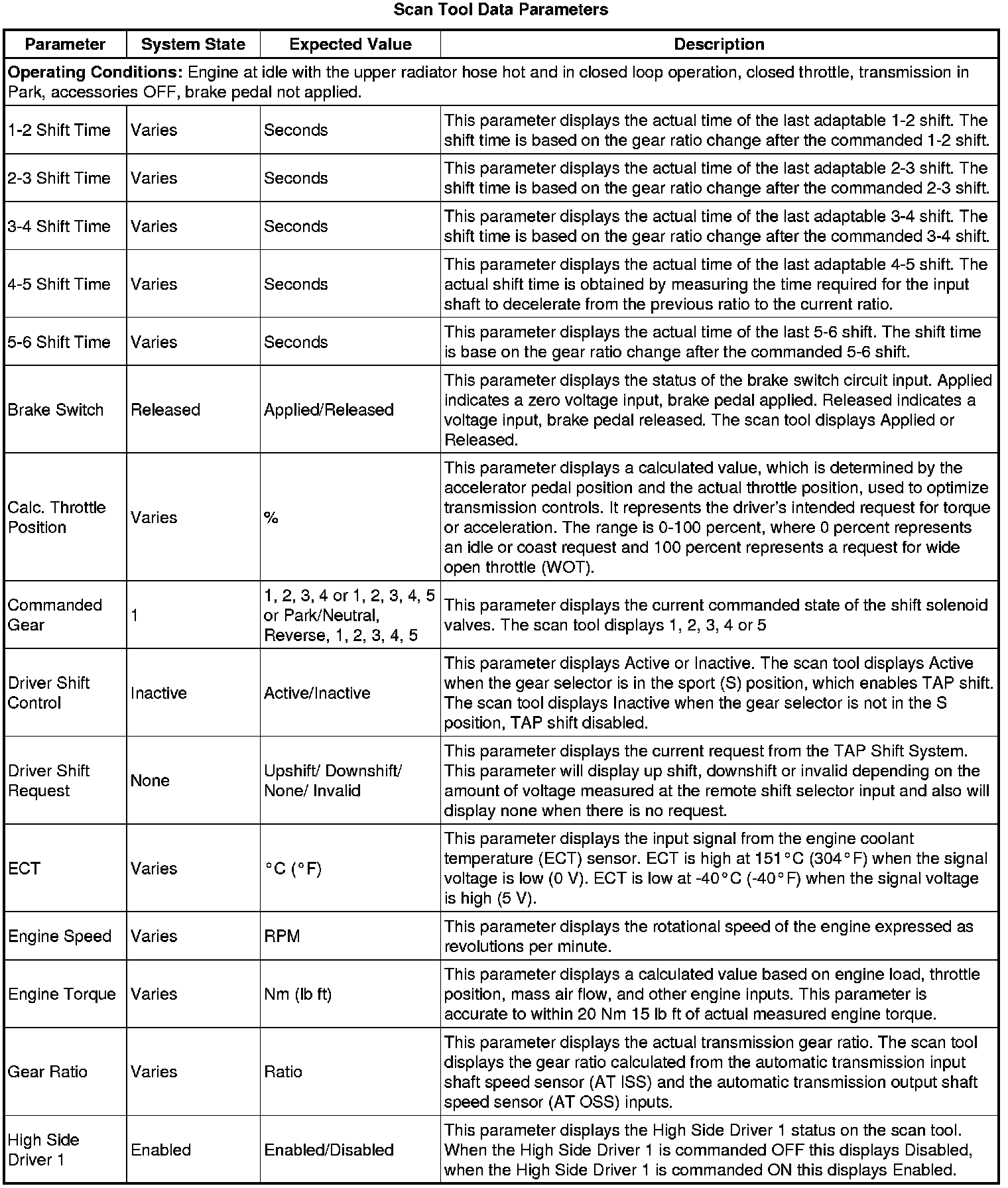 The scan tool values from a properly functioning transmission may be used for comparison with the transmission you are diagnosing. The values below represent a typical display recorded from a properly functioning system.
