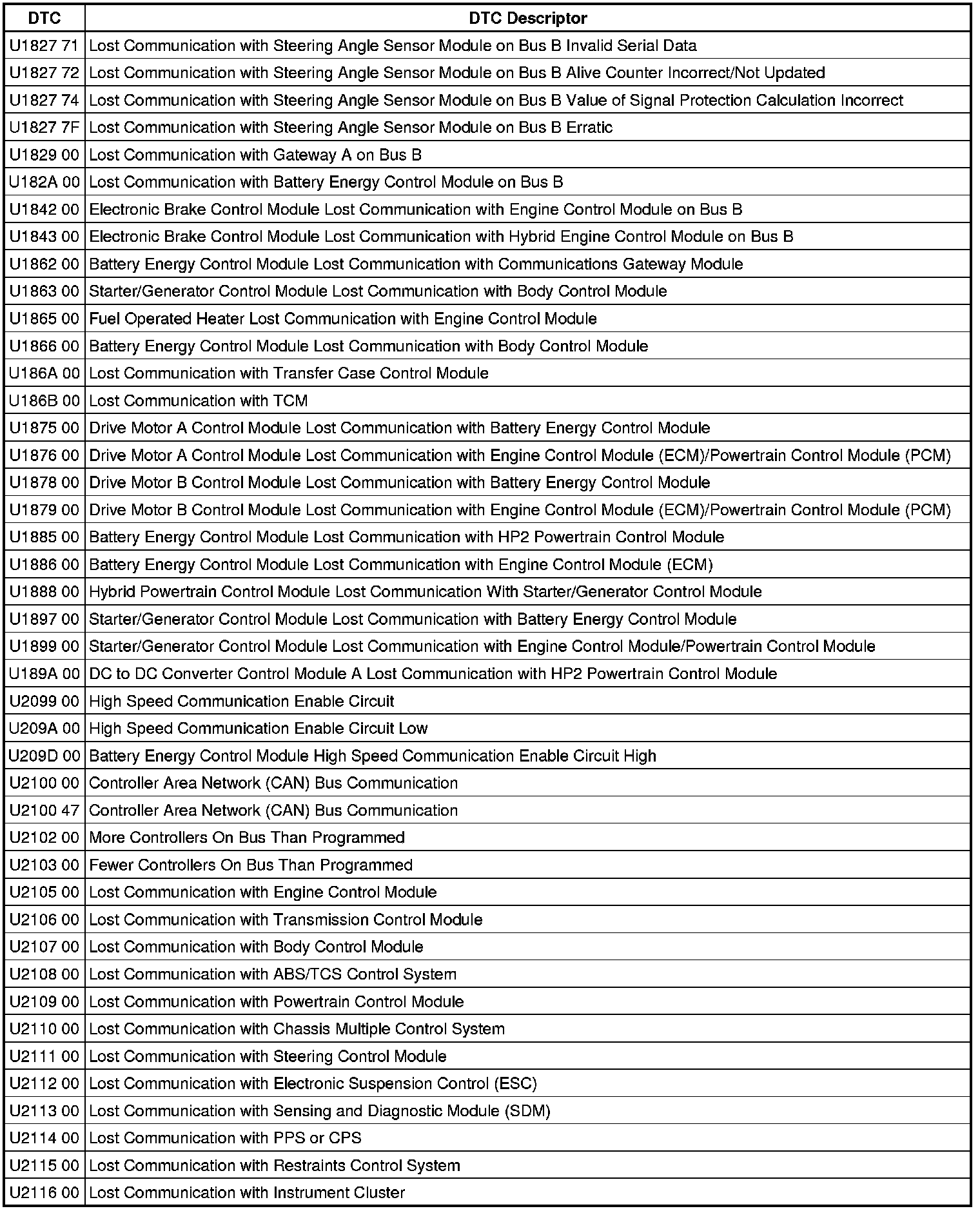 This list includes all Data Communications related U-code DTCs in alphanumeric order with descriptors for all modules. Not all DTCs listed will be applicable to all vehicles.