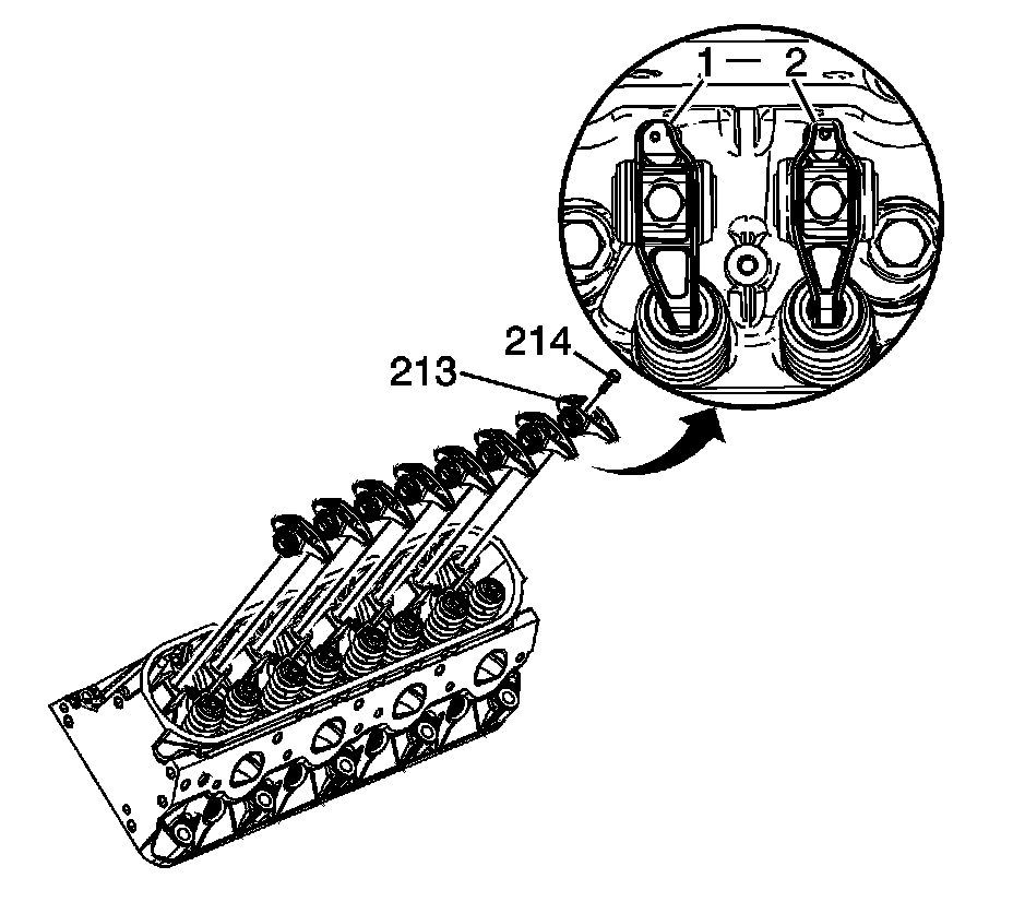 4. Install the rocker arms (213) and bolts (214). Note the locations of the intake (1) and exhaust (2) valve rocker arms. The intake rocker arms (1) have an offset design.