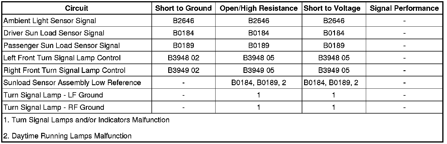 The ambient light sensor is used to monitor outside lighting conditions. The ambient light sensor provides a voltage signal that will vary between 0.2-4.9 volts depending on outside lighting conditions. The HVAC control module provides a low reference ground and a 5 V reference signal to the ambient light sensor. The HVAC control module monitors the ambient light sensor signal circuit to determine if outside lighting conditions are correct for either daytime running lights (DRL) or automatic lamp control (ALC) when the headlamp switch is in the AUTO position. The HVAC control module sends a signal to the body control module (BCM) via serial data commanding the BCM to turn the front turn signal lamps on steady (non-flashing). Any function or condition that turns on the headlamps will cancel the DRL operation. With the turn signal/multifunction switch in the OFF position, the turn signal lamps will either be turned ON or OFF after a 30-second delay, depending on whether daylight or low light conditions are sensed by the ambient light sensor.