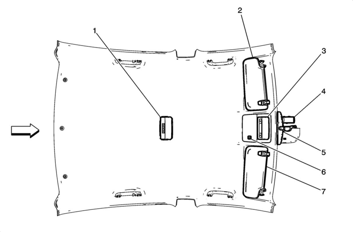 In the passenger compartment, above the front center of the headliner.