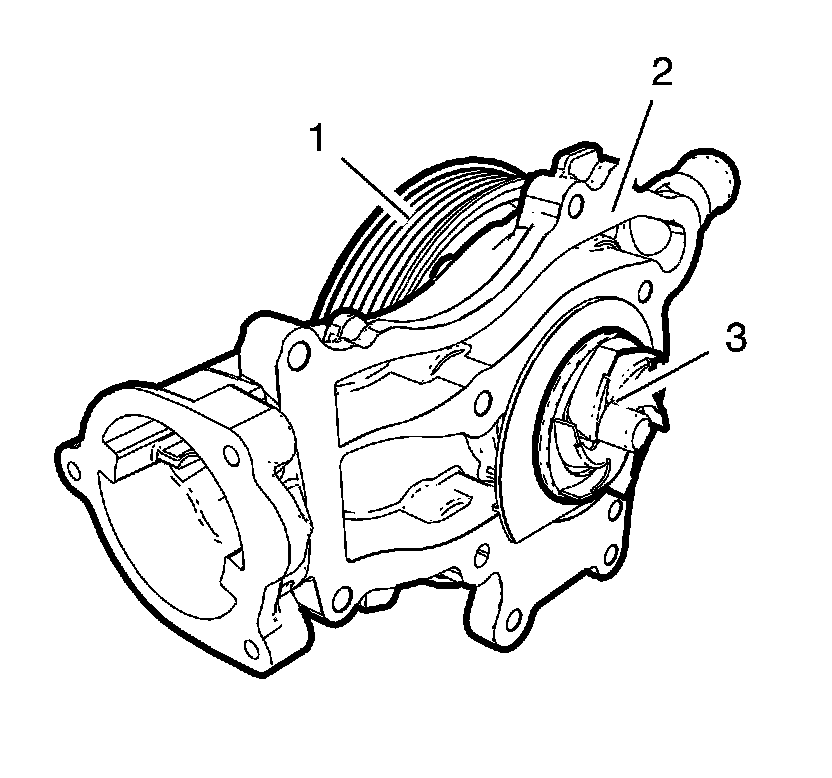 Water pump is a component of the engine cooling system and circulated the coolant from each cooling circuit components. This water pump consists of sealing, bearing, pulley (1) and housing (2) and is driven by the drive belt to loose noise to water pump pulley. Water pump apply drain hole cup to cap to prevent coolant leakage for customers. Water pump is not open impeller type but closed plastic impeller type (3) to increase the cooling efficiency.