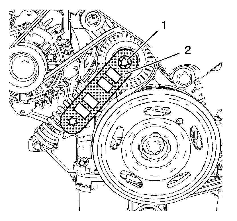 4. Install EN-48488 - holding wrench (2) to the drive belt tensioner (1).