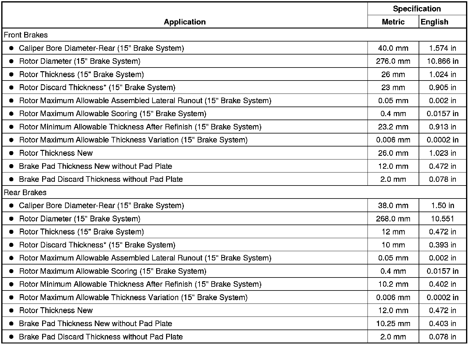 Disc Brake Component Specifications