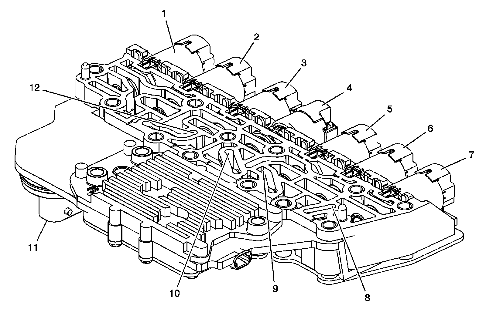 The control solenoid (w/body and TCM) valve assembly contains the following components:
