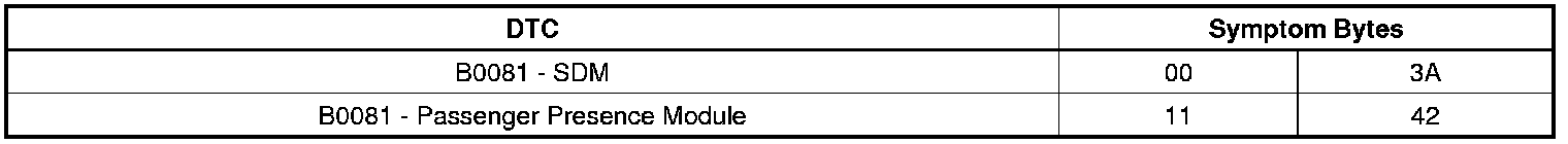 Note: The SDM and passenger presence module can set DTC B0081 but with different symptoms bytes. Therefore it is important to identify which module has set the DTC B0081. Use the symptom bytes as a way of identify the correct module to diagnose. Use the table below in identifying specific module DTC B0081 application and symptom byte that sets with it.