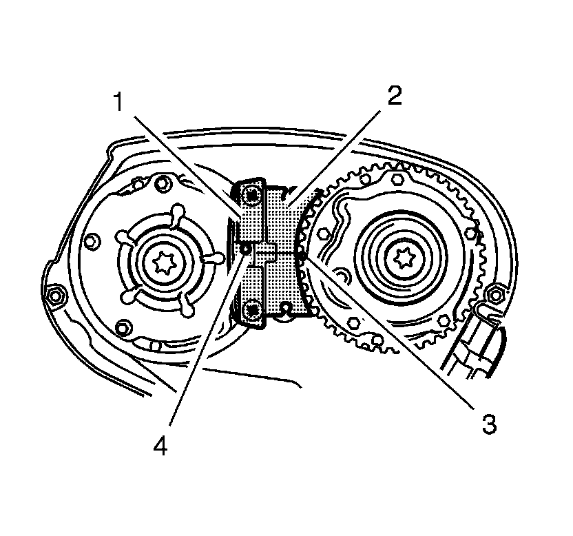 Note: The spot type marking (4) on the intake camshaft position actuator adjuster does not correspond to the groove of EN-6340-left during this process but must be slightly above as shown.