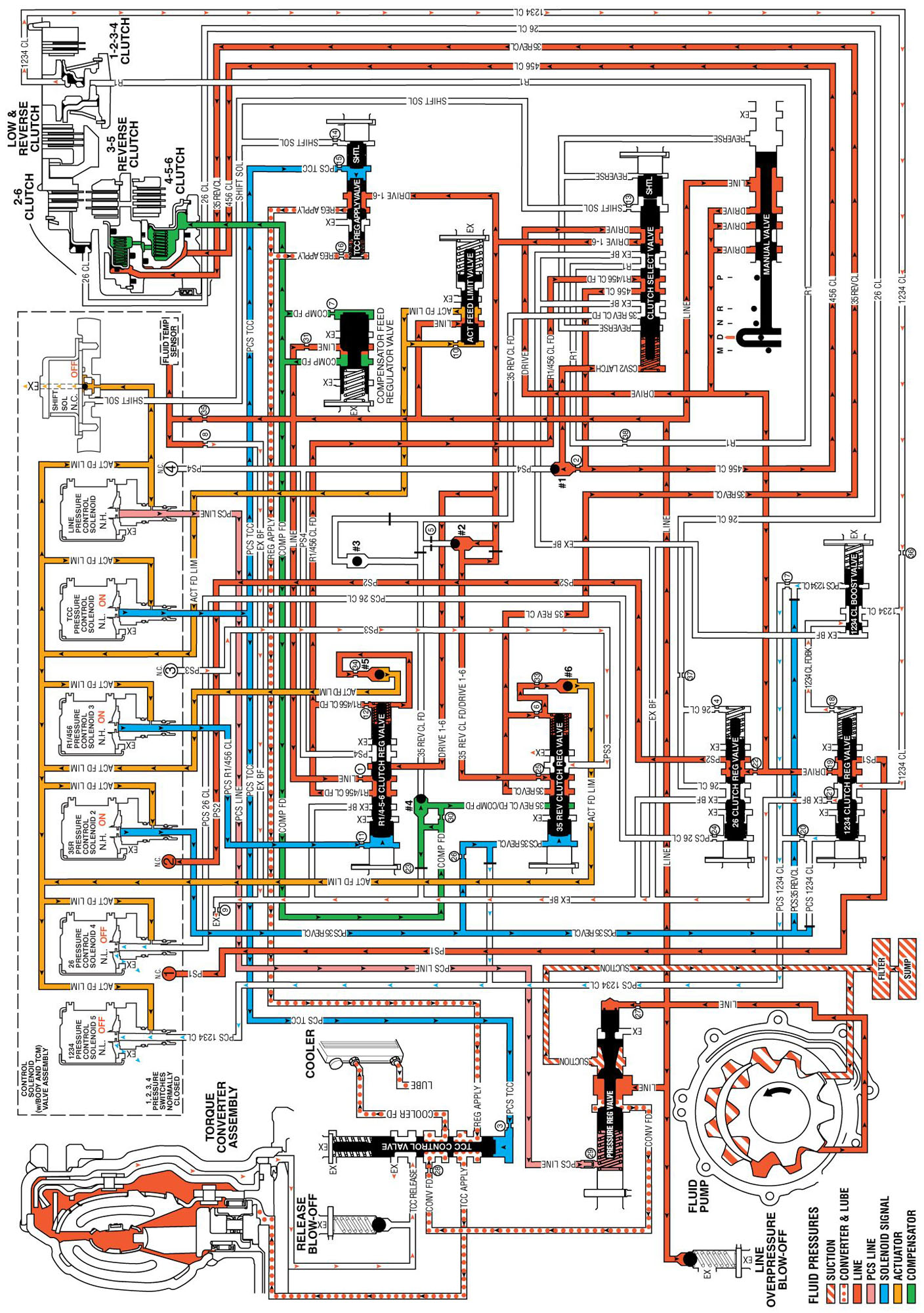As vehicle speed increases, the transmission control module (TCM) processes input signals from the automatic transmission input and output speed sensors, the throttle position sensor and other vehicle sensors to determine the precise moment to command ON the normally-high 35R pressure control solenoid 2. At the same time, the normally-low 1234 pressure control solenoid 5 is commanded OFF and the transmission shifts into Fifth gear.