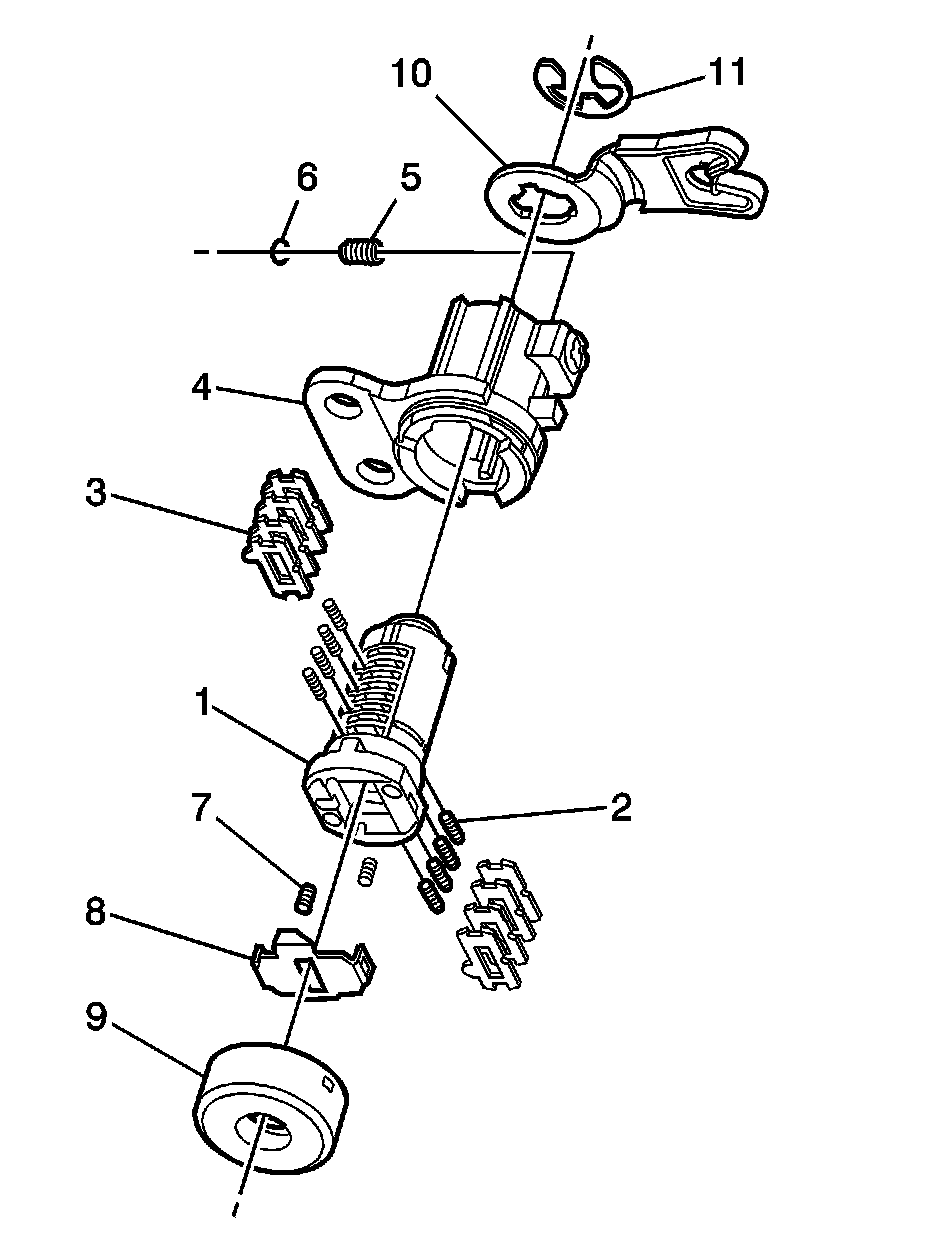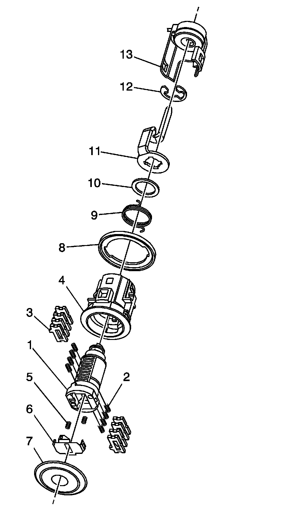 Note: The ignition lock cylinder tumblers (3) are not self-retaining and must be held in place if the key in not fully inserted into the lock cylinder or until the tumbler retainers (4) are properly staked into the cylinder.