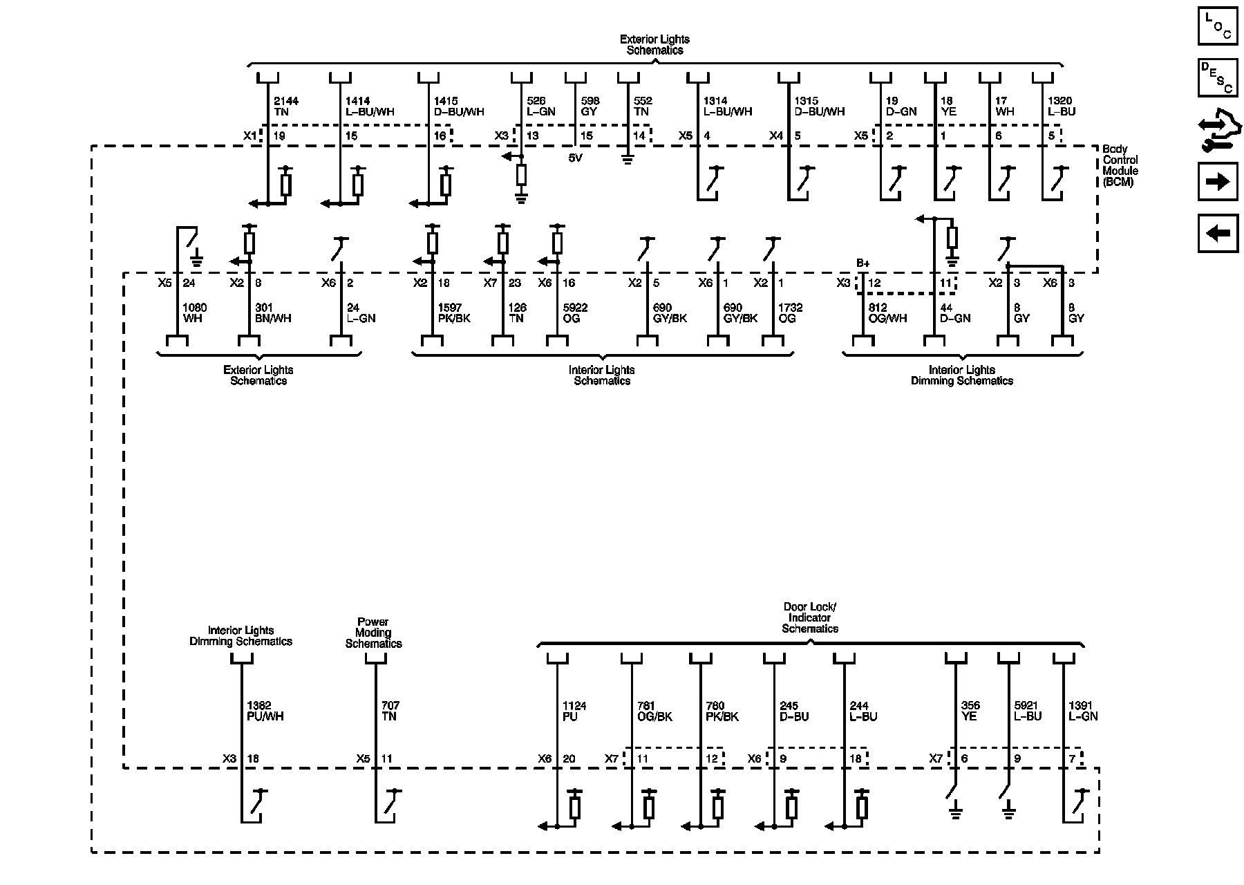 Exterior Lights, Interior Lights, Interior Lights Dimming, Power Moding, and Door Lock/Indicator References
