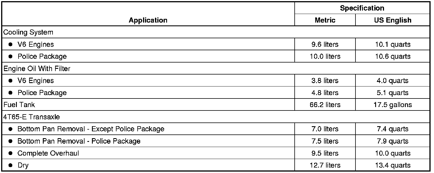 The following approximate capacities are given in US English and metric conversions. See Fluid and Lubricant Recommendations (Maintenance) for more information. All capacities are approximate. When adding, be sure to fill to the approximate level, as recommended in this manual. Recheck fluid level after filling.