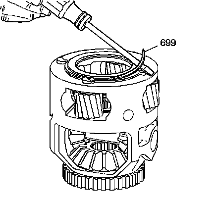 1. Use a screwdriver in order to remove the snap ring (699) from the front differential carrier.