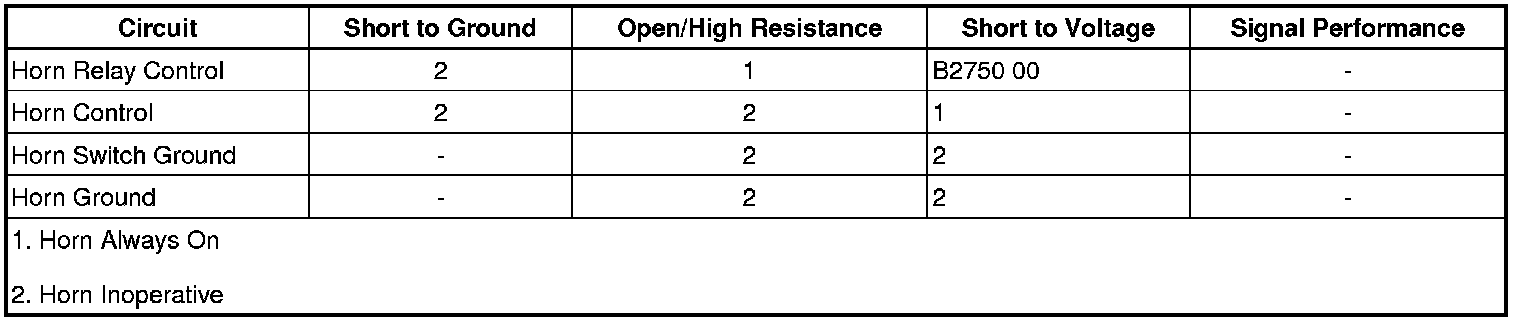 If the test lamp is always OFF and the circuit fuse is open, test the control circuit for a short to ground. If the circuit tests normal, test or replace the horn assembly.